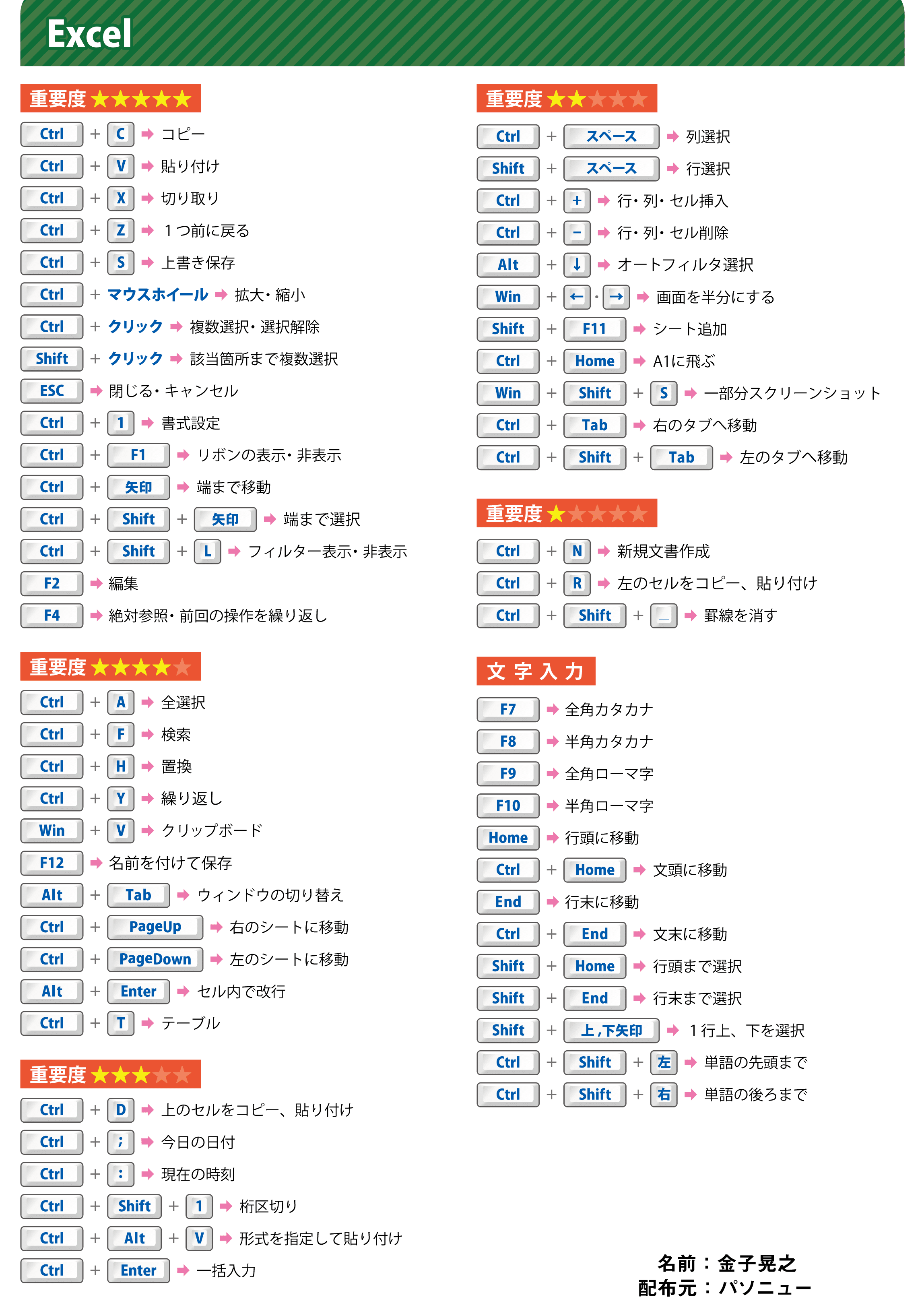 エクセルでよく使うショートカットの一覧は、以下の通りです。