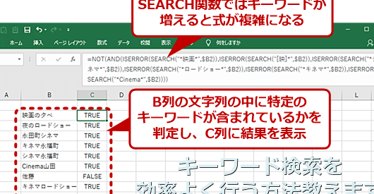 Excelでは、SEARCHやFINDなどの関数を利用して、セルに指定した文字列が含まれているかどうかを判断することができます。