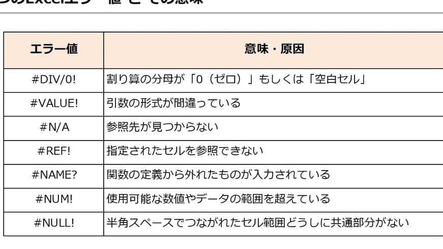 | VALUE! | 不適切なデータ型が含まれている | 数式内のデータ型を確認・変換 |
