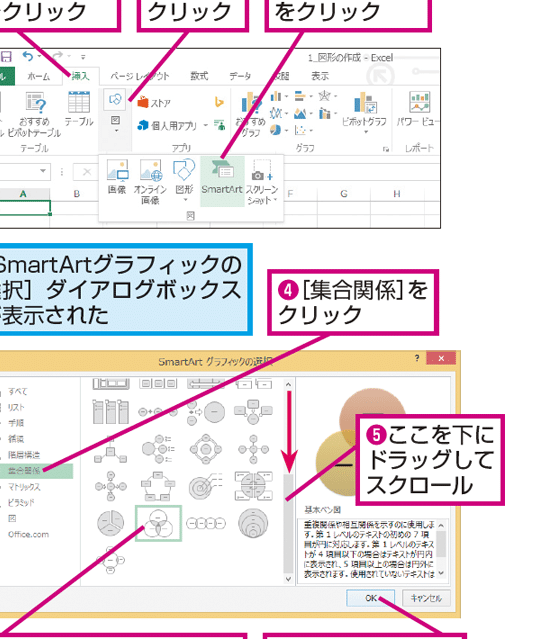 Excelの表をもとにスマートアートを作成するには、まず表を選択し、[挿入]タブの[図]グループにある[スマートアート]をクリックします。次に、目的や好みに合わせた図形を選択し、[OK]をクリックします。選択したスマートアートが表に追加されます。