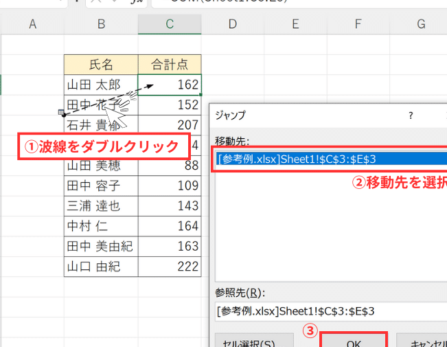 Excelで参照先が別シートにある場合、参照先へジャンプするには、次の方法があります。 参照先のセルを選択し、キーボードの「F5」キーを押します。参照先のセルにジャンプします。