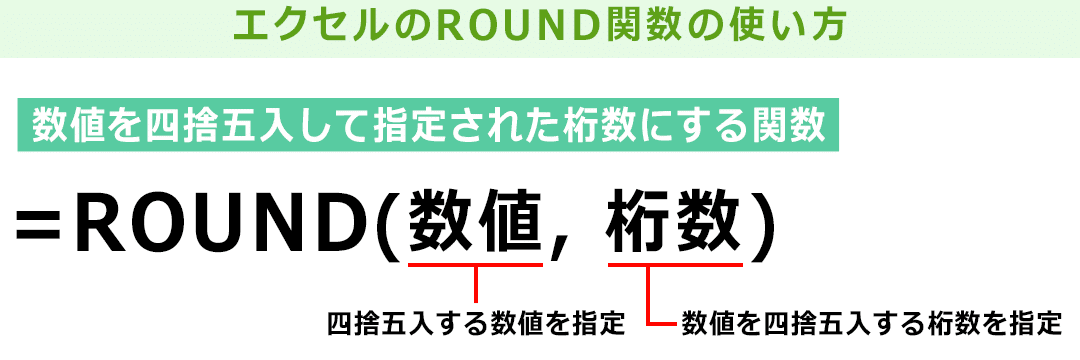ROUND関数には2つの引数があります。1つ目は四捨五入したい数値、2つ目は四捨五入する桁数を 示しています。例えば、ROUND(123.456, -1)と入力した場合、123.456を10の位で四捨五入して120とします。同様に、ROUND(123.456, 1)と入力すると、123.456を小数点第一位で四捨五入して123.5となります。