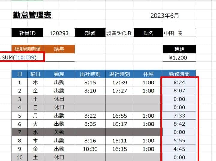 IF関数を使って、終了時刻が開始時刻よりも前である場合(つまり、日を跨ぐ場合)に適切に計算することができます。