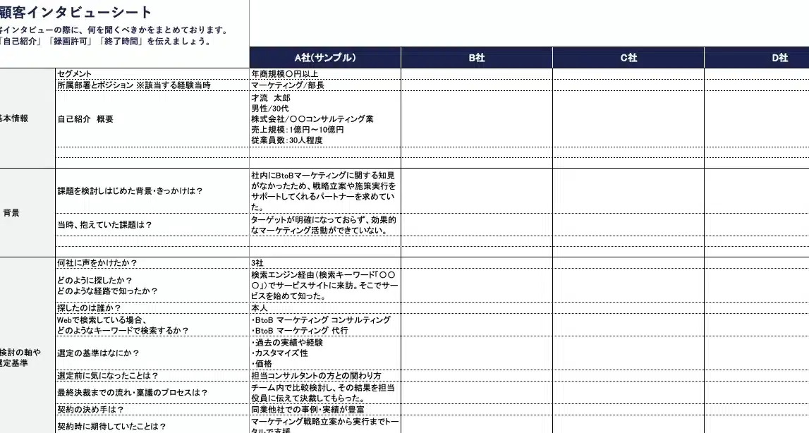 - 非構造化インタビューシート:自由形式で回答を求めるタイプ
